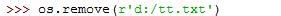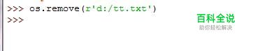 使用os下的remove命令来删除该文件,参数是r'd:/tt.txt’,通常路径字符串都是用r字符串