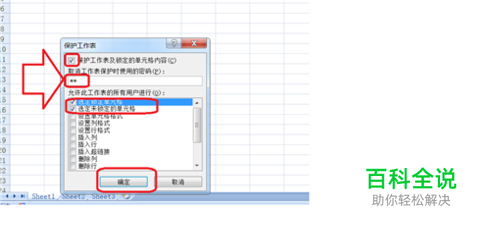 3、出现保护工作表功能框,在保护工作表和锁定单元格的内容前的方框内打上对号,输入密码,单击确定。