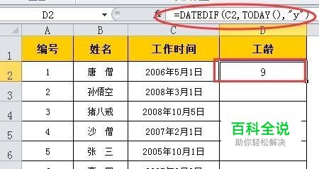 光标定在D2单元格中,输入公式“=DATEDIF(C2,TODAY(),"y")”,敲回车确认。唐僧的工龄就自动出现了,注:C2单元格是唐僧的工作时间,TODAY()函数获取的是系统当前日期。