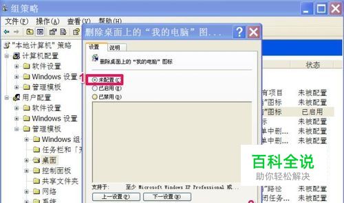 2,进入组策略窗口后,按此“用户配置”->“管理模板”->“桌面”路径,找到右铡的“删除桌面上我的电脑图标”这一项,双击。