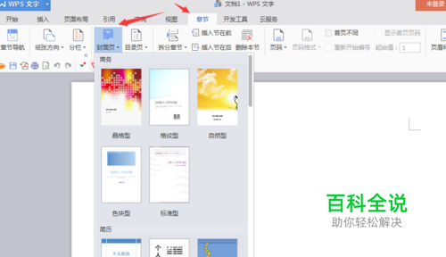 首先介绍使用软件自带的封面页,WORD和WPS自带的封面页不同,点击“章节”,然后点击“封面页”,里面就有很多封面模版供选择。