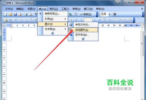 在菜单栏依次单击“插入”--“图片”--“自选图形”,如图所示。