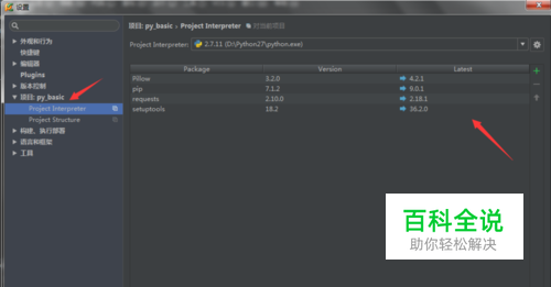 在弹出的“设置”菜单栏中,找到自己的项目,如图中的“py_basic”,点击下面的“Project Interpreter”,在左侧显示的就是已安装的模块。点击图上的“+”,来添加模块。