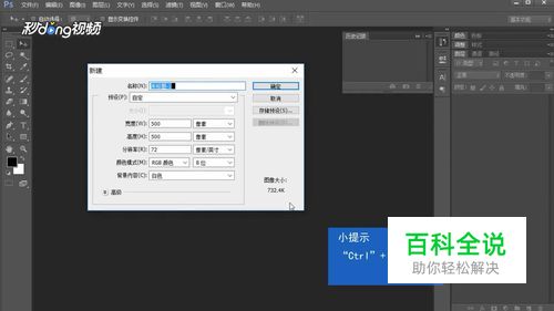 首先我们打开PS,按“Ctrl”+“N”新建一个文件,设置宽度和高度为500像素,其他采用默认设置,左键单击“确定”。