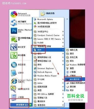 第一步:点击桌面开始,打开程序/附件/命令提示符。