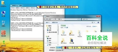 然后把下面的代码全选,复制一下,黏贴进去。 Windows Registry Editor Version 5.00 [HKEY_LOCAL_MACHINE\SOFTWARE\Microsoft\Windows\CurrentVersion\Explorer\Advanced\Folder\Hidden\NOHIDDEN] "RegPath"="Software\\Microsoft\\Windows\\CurrentVersion\\Explorer\\Advanced" "CheckedValue"=dword:00000002 "DefaultValue"=dword:00000002 [HKEY_LOCAL_MACHINE\SOFTWARE\Microsoft\Windows\CurrentVersion\Explorer\Advanced\Folder\Hidden\SHOWALL] "RegPath"="Software\\Microsoft\\Windows\\CurrentVersion\\Explorer\\Advanced" "DefaultValue"=dword:00000002 "CheckedValue"=dword:00000002