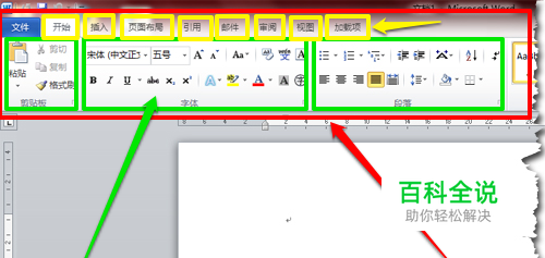 打开Word软件,我们先来熟悉功能区的构成。红色框的区域便是功能区(ribbon),默认状态下,它包含8个黄色框所标注的“选项卡”(tab),每个选项卡包含绿色框所标注的几个“组”(group),一些常用的功能按照类别分布在各个组里。