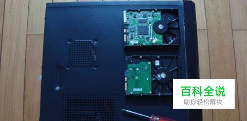 关闭电脑的电源,把计算机的主机箱平放在地板上,并准备好一个小起子和一个新的台式机硬盘,如下图所示。