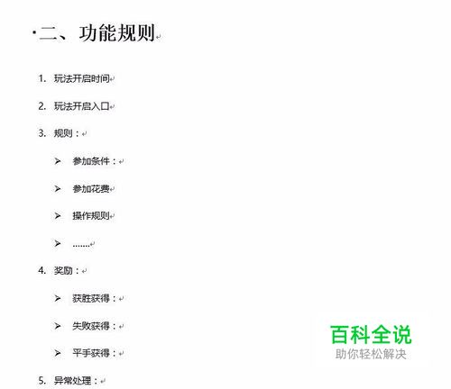 功能规则和功能要点 一个好的策划案,需要把功能点提炼出来,按照1,2,3,4这种排列顺序罗列出来,以方便阅读者知晓规则和目的 一般写策划案使用Word文档,注意写清楚标题