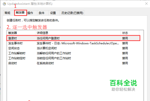 双击 UpdateAssistant>> 触发器选项 >> 选中“ 登陆时”触发器 >> 点击“ 编辑”>> 取消勾选已启用>> 确定 (相同步骤处理“ 发生事件时”、“ 空闲状态”、“ 工作站解锁时”、“ 工作站锁定时”、“ 启动时”等触发器)