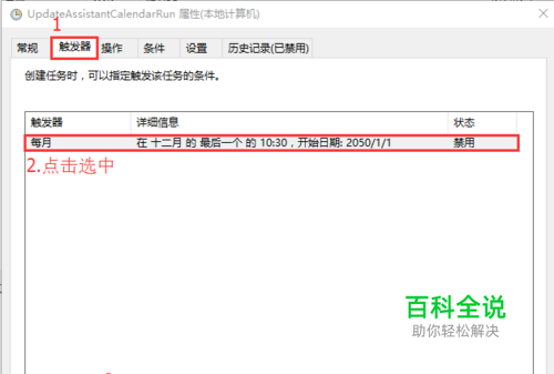 双击 UpdateAssistantCalendarRun>> 触发器选项 >> 选中触发器 >> 点击“ 编辑”>> 取消勾选已启用 >> 为保险起见,可把橙色框中的时间改为很久以后 >> 确定 (相同步骤处理 UpdateAssistantWakeupRun)