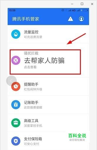 打开手机上面的安全管理软件,点击这个软件界面下方,即手机屏幕下方的“骚扰拦截”。(如下图所示的腾讯手机管家)