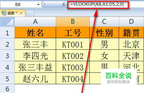 将B8公式修改成: =VLOOKUP(A8&"??",A1:D5,2,0) 第一参数使用两个问号,表示以“张三”开头后面有两个字符长度的姓名对应的工号,也就是“张三丰益”对应的工号信息。