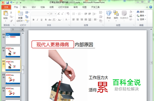 文字要少:做ppt时,文字能少则少,能用图片代表文字的就用图片代表,能把文字转换成图表的就把文字转换成图表,在一张幻灯片中的文字尽量压缩在25个字之内为易。如下图,观众一看图片,就能感受到此人活的很累,就无需再有过多的文字来表述了。