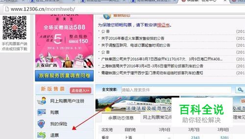 12306订的票怎么退 2025-05-19 06:40:14 12306退票 操作方法 01 登录12306网站 输入你的账号密码 到达第一页 02 点击退票按钮 到达退票窗口 03 点击已成订单 就可以退票了 不过要扣些钱 04 到达退票界面 赞 (0) 相关推荐 12306订的票怎么取票 12306订票后怎么取票?,需要什么证件之类的东西么?怎么上车呢?下面分享下我的! 操作方法 01 最快捷的是找到!离你最近的火车票代售点!让他刷下身份证!交5块钱的手续费!不区分异地还是本地 02 ... 12306订票助手.net如何使用?12306订票助手.net图文使用教程 12306订票助手.NET版是一款火车票订购的辅助工具,也是最热门的一款订票辅助工具,下面小编就为大家讲解12306订票助手.net具体的使用方法. 推荐下载: 首先要登陆账号,因为不登陆账号查询余票 ... 12306订票助手怎么用? 第一步,如何设置自动刷票? 在“车票查询”页面上,12306订票助手增加了许多功能选项,最突出的就是自动刷票。输入车次等基本信息之后,就可设定自动查询周期了,如每6秒一次,刷不出票誓不罢休。 第二步, ... 12306订票怎样添加联系人 每年一度的订票大战正在如火如荼的进行,帮朋友买票是少不了的,那在我们的12306订票账户中怎样添加联系人呢?今天就来分享一下:手机版中 12306订票怎样添加联系人 操作方法 01 下载最新版本的12 ... 12306订票怎么付款 正值春运高峰,发现大家对12306购票充满了很多疑问,这篇先写关于12306订票怎么付款的问题,稍后我会写一个详细的网络购票流程.希望能帮助到大家. 操作方法 01 在我们完成订票的流程后选择查看订单 ... 怎么用手机12306订票、取票? 现在用手机软件就可以在线订票方便又快捷.下面我来告诉大家怎么用手机12306订票,以及怎么取票吧. 操作方法 01 首先打开智行12306这个app,如图1所示.进入智行后,你会看到一个新的界面,如图 ... 12306网上抢票攻略大全 临近春节的这几天购票高峰期,www.12306.cn作为网购火车票的唯一官方网站,被蜂拥而至的购票人群整治的惨兮兮的。 上12306购票难,难的在于重点在于三点: ◆ 一是登陆难:“当前访问用户过多, ... 12306网上退火车票怎么退? 最近发现网上许多12306订票的兄弟姐妹改签或退票之后没收到钱很懊恼.我就研究一下,发现一些旅客在12306官网上常常会遇到一些问题,最严重的就是退票之后收不到钱,还有就是付款网站显示不出订单,导致许 ... 春运抢票抢不到怎么办 12306退票放票时间 春运抢票抢不到怎么办 12306退票放票时间 火车票放票时间定义:只是影响当天可以预定到的最远那天火车票。期间的是不受影响的,7:00到23:00,电话网络订票系统一开,就可以订了。只有最远那天的车票 ...