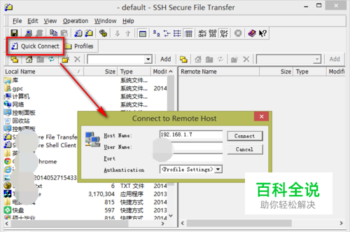 ③ 打开SSH Secure File Transfer Client,点击【Quick Connect】,填写【Host Name】和【User Name】,其余参数保留默认值