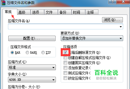进入WinRAR压缩包界面,点击“常规”子页,将“压缩后删除源文件”勾选。 然后再点击“文件”子页,将“把每个文件放到单独的压缩文件中”勾选。