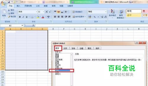 在弹出的“设置单元格格式”对话框中选择“数字”选项卡,并选择“文本”格式,单击确定按钮。