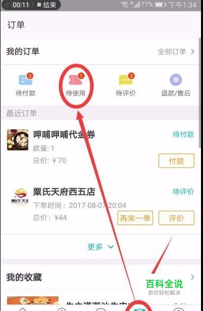 进入美团之后点按界面下方的订单标志,在下一个界面点按界面上方的待使用标志。