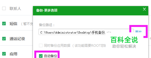 点击“更改”选择备份路径,以备下次可以找到。同时勾选“自动备份”,这样下次当联系手机后,手机助手就自动备份了,点击“确定”。