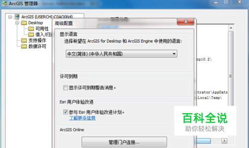 2.2待打开arcgis管理器之后,在arcgis管理器界面找到“高级”按钮,点击该按钮,进入高级配置界面,在该界面,我们即可看到“显示语言”功能设置对话框,如图