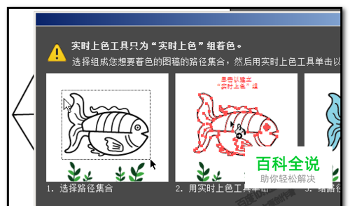 接下来,用实时上色工具,把这六份分别填充上不同的颜色。 如果我们直接就这样按下快捷键K ,或是在工具箱中选取实时上色工具。点击图形时,不能使用此工具,并弹出一个对话框,此对话框教我们在什么情况下使用实时上色工具。