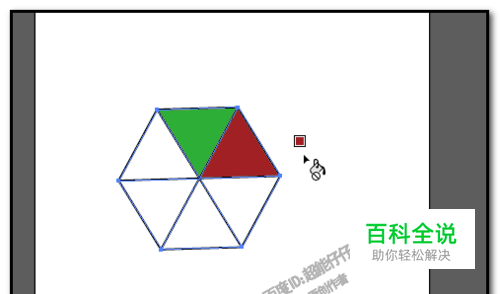 我们要使用实时上色工具,我们要先用选择工具把六角形选中, 然后,按K键,实时上色工具;鼠标放在六角形的其中一份上,这时,鼠标上呈出出一行红色的字:单击以建立实时上色组