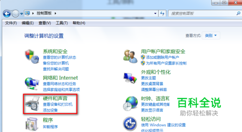 打开控制面板主页,找到硬件和声音并单击。
