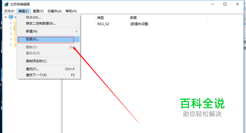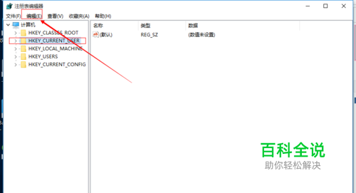 在开始菜单右边的输入栏输入:regedit,就会出现”regedit 运行命令“。按回车键(Enter)或点击该命令,就会打开注册表编辑器。在注册表编辑器窗口,选中左边菜单栏里的:HKEY_CURRENT_USER,再点击菜单栏里【编辑】权限功能。