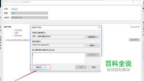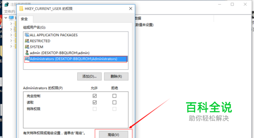 打开了HKEY_CURRENT_USER的权限对话框,在对话框中,查看本机登录的用户名,如”组或用户名(G)“栏中没有用户,点击【高级选项】。