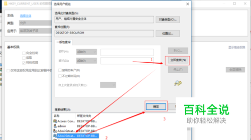 然后在对话框中点击1.【立即查找(N)】2.在“搜索结果(U)”栏中用鼠标按住右侧的小滑块向下拖动,找到本机登录的用户名如:DESKTOP-BBQUROH,并左键单击用户名 3.再点击【确定】。