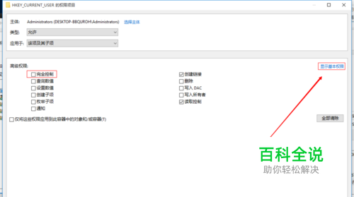 这时回到“HKEY_CURRENT_USER的高级安全设置”窗口,点击【显示高级权限】,在“HKEY_CURRENT_USER的权限项目”窗口的高级权限下,点击完全控制,再点击【确定】。