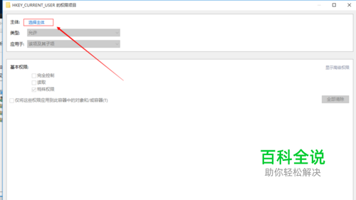 “HKEY_CURRENT_USER的高级安全设置”窗口点击【添加】,就会打开“HKEY_CURRENT_USER的权限项目”窗口,在这个窗口中,基本权限项都呈灰色状态不可选择,点击【选择主体】。