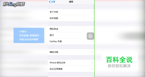 首先我们打开主屏上的设置应用,接着在设置列表中打开通用选项,在通用列表中找到访问限制功能,点击打开。