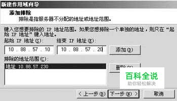 添加IP地址范围 当DHCP服务器被授权后,还需要对它设置IP地址范围。通过给DHCP服务器设置IP地址范围后,当DHCP客户机在向DHCP服务器申请IP地址时,DHCP服务器就会从所设置的IP地址范围中选择一个还没有被使用的IP地址进行动态分配。添加IP地址范围的操作如下: 1. 点击“开始→程序→管理工具→DHCP”,打开DHCP控制台窗口。 2. 选中DHCP服务器名,在服务器名上点击鼠标右键,在出现的快捷菜单中选择“新建作用域”,在出现的窗口中单击[下一步]按钮,在出现的对话框中输入相关信息,单击[下一步]按钮,如图1所示。 图2 3. 在图1所示的窗口中,根据自己网络的实际情况,对各项进行设置,然后单击[下一步]按钮,出现如图2所示的窗口。 4. 在图2所示的窗口中,输入需要排除的IP地址范围。由于校园网络中有很多网络设备需要指定静态IP地址(即固定的IP地址),如服务器、交换机、路由器等,此时必须把这些已经分配的IP地址从DHCP服务器的IP地址范围中排除,否则会引起IP地址的冲突,导致网络故障。 5. 单击[下一步]按钮,在出现的“租约期限”窗口中可以设置IP地址租期的时间值。一般情况下,如果校园网络中的IP地址比较紧张的时候,可以把租期设置短一些,而IP地址比较宽松时,可以把租期设置长一些。设置完后,单击[下一步]按钮,出现“配置DHCP选项”窗口。 6. 在“配置DHCP选项”窗口中,如果选择“是,我想现在配置这些选项”,此时可以对DNS服务器、默认网关、WINS服务器地址等内容进行设置;如果选择“否,我想稍后配置这些选项”,可以在需要这些功能时再进行配置。此处,我们选择前者,单击[下一步]按钮。 7. 在出现的窗口中,常常输入网络中路由器的IP地址(即默认网关的IP地址)或是NAT服务器(网络地址转换服务器)的IP地址,如WinRoute、SyGate等。这样,客户机从DHCP服务器那里得到的IP信息中就包含了默认网关的设定了,从而可以接入Internet。 8. 单击[下一步]按钮,在此对话框中设置有关客户机DNS域的名称,同时输入DNS服务器的名称和IP地址。,然后单击[添加]按钮进行确认。单击[下一步]按钮,在出现的窗口中进行WINS服务器的相关设置,设置完后单击[下一步]按钮。 9. 在出现的窗口中,选择“是,我想现在激活此作用域”后,单击[下一步]按钮,在出现的窗口中单击[完成]按钮,设置结束。此时,就可以在DHCP管理器中看到我们刚刚建好的作用域。 注意:如果您的校园网络是以工作组的形式存在的,可以在第6步的“配置DHCP选项”窗口中选择“否,我想稍后配置这些选项”,此时设置过程跳过第7、8步。如果您的校园网络是以域的形式存在的,建议您的网络配置顺序为:活动目录的建立→WINS的建立→DNS的建立→DHCP的建立,这样可以减少很多麻烦。
