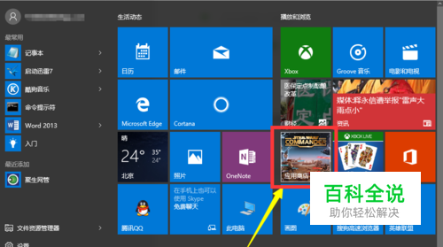 Google搜索应用Win10版下载方法: 点击Win10正式版桌面左下角的“Windows”按钮,从打开的扩展菜单中找到“播放和浏览”栏目中的”应用商店“进入。
