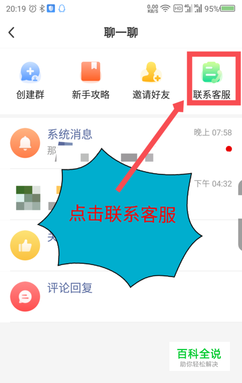 打开聊一聊界面后,在顶部菜单中,最右边的就是联系客服,点击联系客服。如图所示