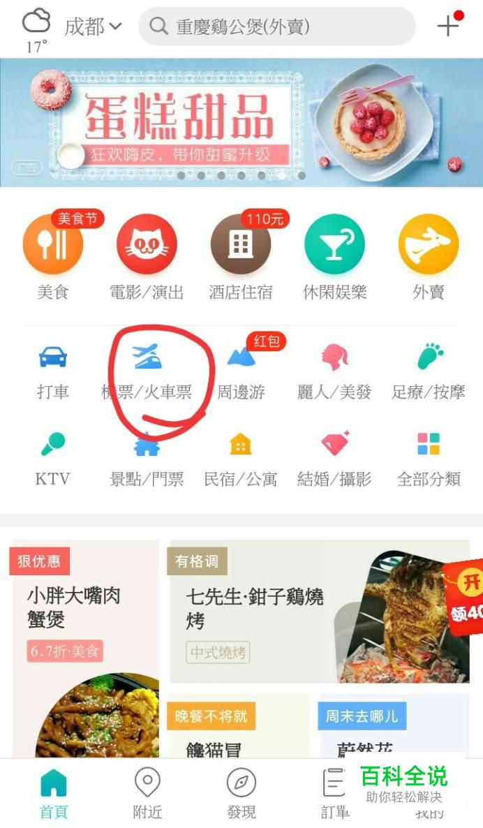 首先打开并登陆美团,点击页面上的“机票/火车票”,点开后再点击“火车票”
