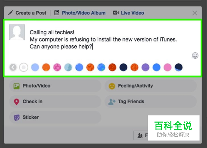 状态要简洁明了,扣人心弦。人是慵懒且没有耐心的生物。他们上脸书的主要目的就是要得到即时娱乐,长篇大论或者是纯文本的状态都不得人心,只会让人一瞥而过。脸书不是部落格,观众不想知道你一天的流水账,早餐吃了什么或者你对绝命毒师最新集的冗长看法。他们喜欢妙趣横生的小笑话,或者摄人心魄的所见所闻。请根据人们的需求发布状态。 与推特不同,脸书没有160字的字数限制,但是你的状态不能无限制的冗长! 如果有部落格,你可以把部落格的链接贴到脸书上,让大家分享你的思绪。如果你以发布独到趣味的状态见长,博客被浏览的可能性就会更大。