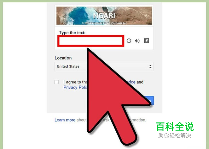 完成验证码。验证码是一个确保你是真人,而非机器程序的验证工具。如果看不清验证码,可以点击验证码旁边的刷新按钮来获取新的验证码,或者点击旁边的扬声器按钮来让它通过电脑喇叭播放读取验证码。 填写完验证码后,选择你目前的位置。就算你计划在其他地方使用你的电子邮箱,你也可以选择你居住地的国家。