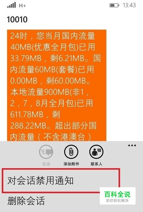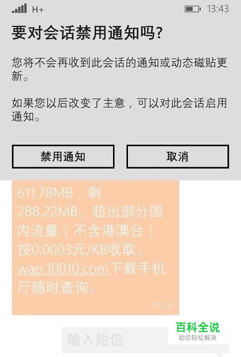 点击“对话禁用通知”可以弹出确认框。点击确认。这时候短信消息的提示就会被关闭,不会出现在任务栏中。