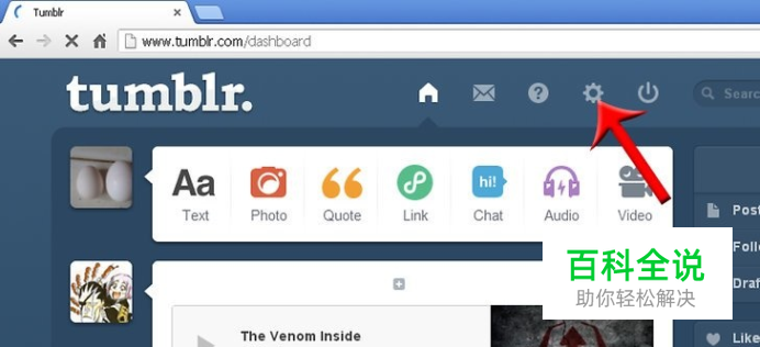 登录Tumblr. 点击页面顶部的齿轮图标进入设置。