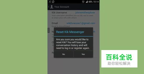 点击重置时弹出的对话框中的“是”按钮。虽然你只是登出,请确保你真的想这样做,因为当你去重新登录它会删除所有的历史和消息。