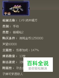 枪魂纳米锯刃枪械属性解析 链锯枪系列 枪械名称: LV9 纳米锯刃 类别: 手动 类型: 链锯枪2 购买条件: 消耗金币1250000 声望60000 主属性: 伤害加成:147% 弹药数量: 13发 射击速度: 3发/秒 附属性: 攻击多个敌人 子弹可穿透敌人