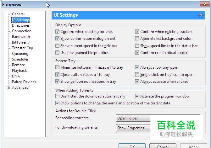 更改用户界面设置,之后uTorrent会: 自动检查更新。 在删除种子文件前会询问。 退出程序时不再弹出确认框。
