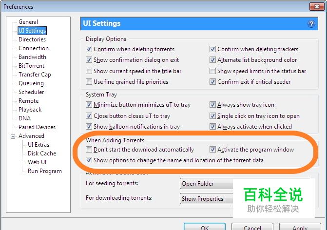 更改下载设置。告诉uTorrent当你添加种子时它需要做: 自动下载种子文件。 弹出一个显示种子内容的窗口。 打开uTorrent主界面。