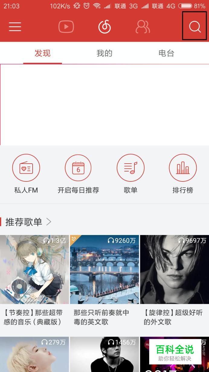 这里以网易云音乐软件为例,打开网易云音乐应用主页面,点击页面顶部“搜索框”按钮。