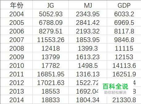首先找到相关数据并列入表格,其中JG代表北京市商品房价格(元),GDP代表北京市国内生产总值(亿元),MJ代表商品房总面积(万平方米)。