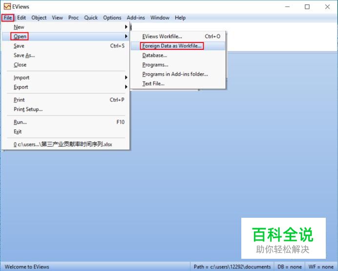 依次点击“File"--"Open"--"Foreign Data as workfile"打开保存的EXCEL文件。
