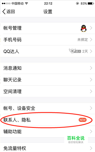 打开设置页面,在第三大项的第二行可以看到 联系人、隐私